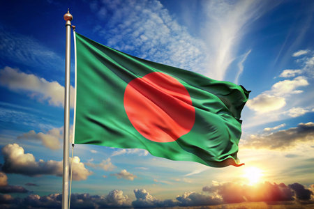 Bangladesh flag waving in the wind against the blue sky with sun