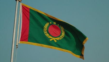 showcases a detailed view of a Bangladesh flag, distinguished by its ornate golden fringe and a central emblem featuring a red circle surrounded by a laurel wreath and stars. A vertical red stripe is present on the hoist side of the flag. The flag is displayed against a clear, bright blue sky, highlighting its intricate and vibrant colors. The texture of the fabric is visible, suggesting a possibly ceremonial, representation.