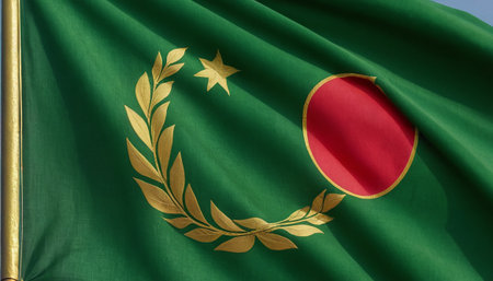 showcases a close-up view of a green flag, its surface textured and showing the folds and creases of the fabric. A distinctive a red crescent shape on the right side, partially encircled by a golden laurel wreath. The wreath's leaves are detailed and appear to be woven into the flag's The flag is in motion, with gentle waves visible across its surface. The background is a soft, diffused light, likely a clear sky, providing a neutral backdrop that emphasizes the flag's colors and intricate...