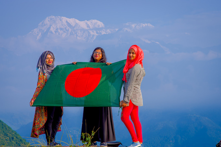 Pockhara, Nepal, September, 06 -2017: Close up of three beautiful nepalese women wearing a hijab and holding a a flag in their hands in a nature background.