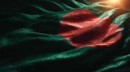3D Flag of Bangladesh on wrinkled fabric.