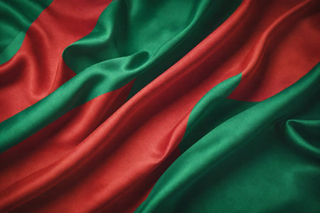 Bangladesh country flag on wavy silk textile fabric background.