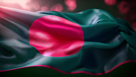 A detailed, close-up view of the flag of Bangladesh. The vibrant green fabric serves as the background for the iconic bright red circle, representing the sun rising over the country. The texture of the woven textile is visible, adding a tactile to the composition is minimalist and focuses solely on the flag's emphasizing its bold and recognizable symbolism. The background is a neutral, textured surface.
