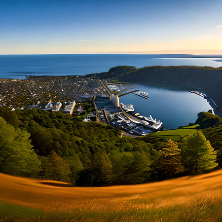 Serene sunset over a tranquil seaside town, with sailboats gently gliding on calm waters, evoking a sense of relaxation and coastal charm during the summer months. Generative AI