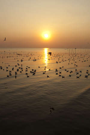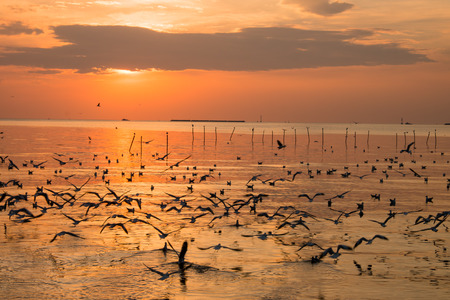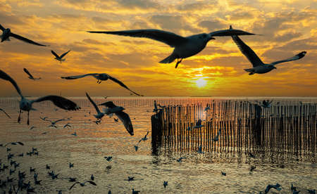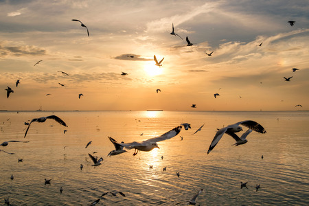 Flock of seagulls flying on sea gulf of thailand at sunset