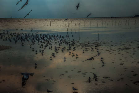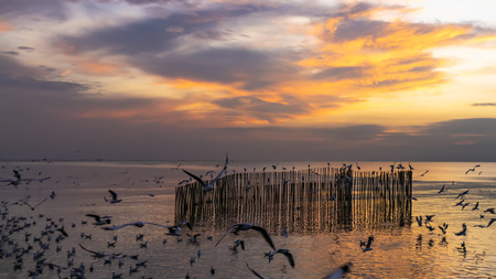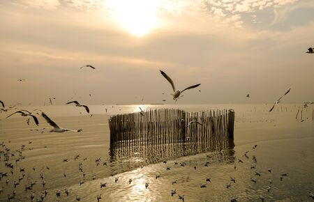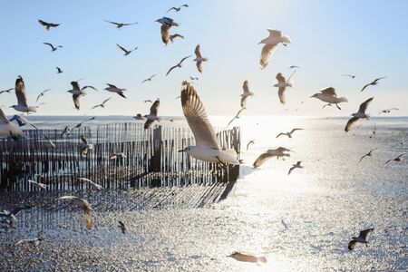 Seagull evacuate the cold from the northern hemisphere to bangpu, Samutprakarn, Thailand during winter on November to March. Sea and sky with many seagulls were very beautiful time.