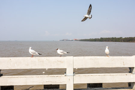 Views of Many seagulls stand at the Bridge Edge and with Gulf of Thailand