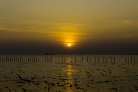 the sunset at Bang Pu, There are lots of seagulls flying, Recreation Center, Thailand.
