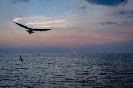 Seagulls bird flying over the sea with beautiful sunset on evening twilight at Bang Pu Recreation Centre