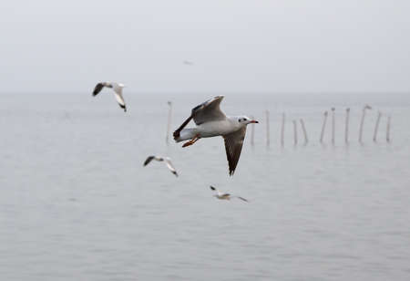 Focus on moving Seagull. Seagull evacuate the cold from the northern hemisphere to bangpu, Samutprakarn, Thailand during winter on November to March.