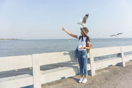 Woman who will enjoy to playing with a seagull.