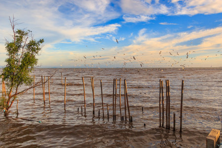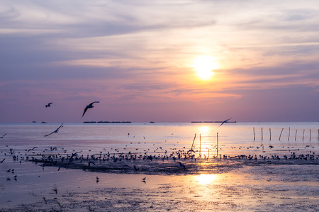 Evening sunset on the beautiful landscape with some seagulls flying in the sky at Bangpu, Thailand.