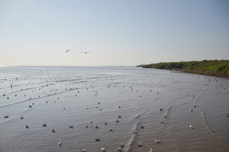 Regular seasonal movement migration of seagulls birds at Bangpu Recreation Center in bay of bangkok for thai people and foreign travelers travel visit at Samutprakarn city in Samut Prakan, Thailand