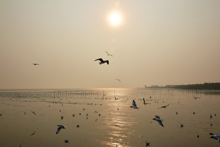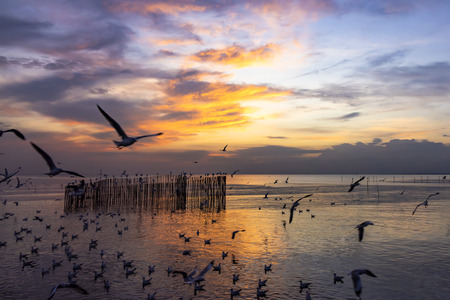 The hoard of seagulls flies freedomly at the beautiful seashore landscape of Bangphu of Thailand