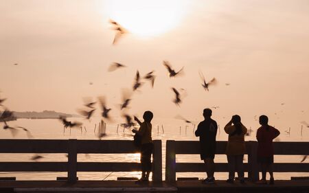 Samutprakarn, Thailand - November 18, 2017: Silhouetted scene of people feeding food to flying seagulls in motion blur with sunrise background.