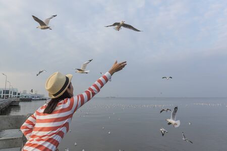 People feeding group of seagull fly over at Bang Pu seaside recreation center, Thailand.