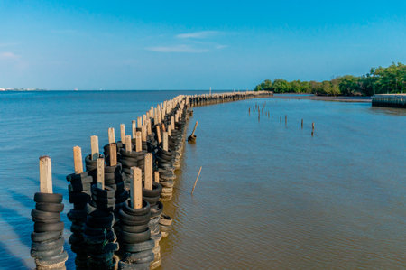 On the edge of the sea, there are wooden poles protecting the waves, and behind it is the sky.
