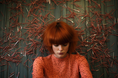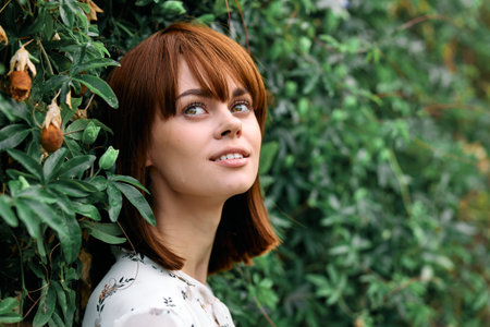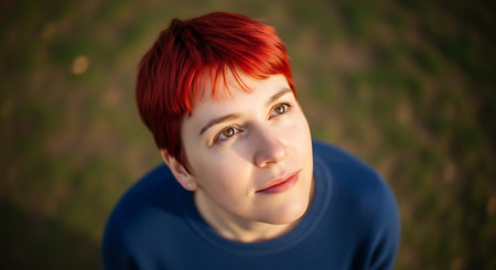 A close-up shot of a woman with short red hair, wearing a blue sweater, gazing upwards with a contemplative expression. The background is blurred, suggesting an outdoor setting.
