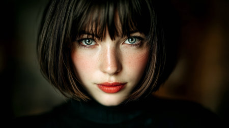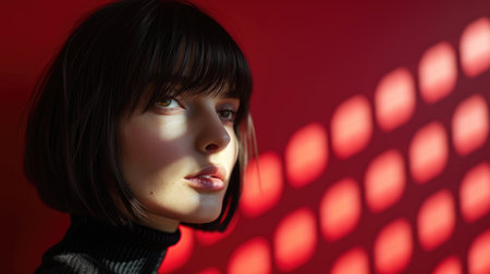 A model stands in a professional studio, her sleek bob hairstyle frames her face. She wears a dark outfit, highlighting her striking features and bold red lips. The overall look exudes confidence.