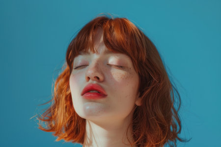 Cute girl with red bob hair, bangs and closed eyes smiling on blue background.