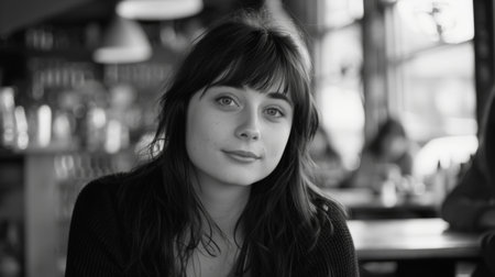 Portrait of a beautiful young woman in a cafe. Black and white photo.