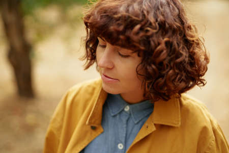 Outdoor lifestyle close up portrait of curly brunette woman in orange jacket in autumn park. Relaxation, fall and autumn portrait concepts.