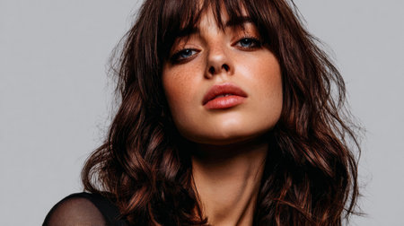 This stunning close-up portrait features a young woman with natural makeup, soft curls, and a warm expression. The beauty of her skin and freckles shines against a neutral backdrop.