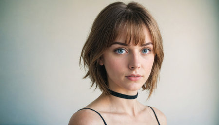 A woman with short brown hair and blue eyes looks directly at the camera while wearing a black choker