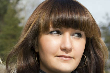 Portrait of a woman with brown hair on her face. Focus on the hair