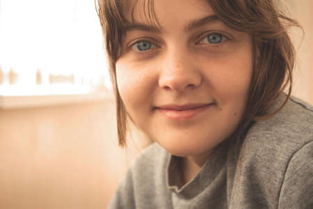 Happy young girl with freckles looking at the camera, shot in the warm colors