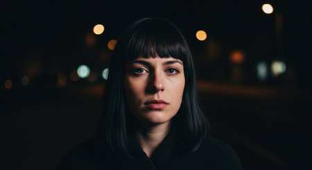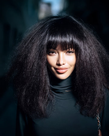 A young woman with long, dark hair stands against an urban backdrop during twilight. She wears a stylish outfit and has bold makeup, exuding a confident presence.