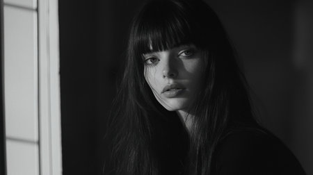 A young woman with long, dark hair gazes contemplatively while bathed in soft, dramatic lighting. The monochrome effect enhances her features and creates a mysterious vibe.