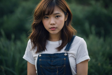 A young girl stands quietly in a softly lit room, casually leaning against a white wall. Her long black hair frames her face as she glances calmly towards the viewer, creating an introspective mood.
