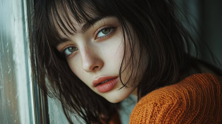 Close-up portrait of a young woman with a thoughtful expression, leaning by a window, showcasing natural beauty and emotion in a soft, introspective setting.