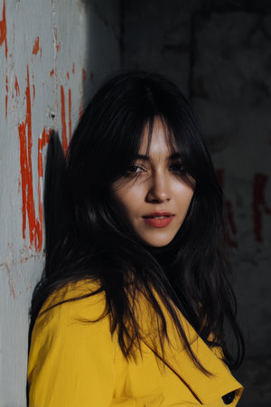 A woman with long hair is leaning against a textured wall with red markings. She wears a bright yellow coat and looks directly at the camera with a calm expression during late afternoon.
