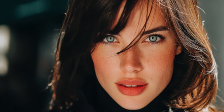 A young woman with vibrant blue eyes and smooth freckled skin gazes directly at the camera. Her dark hair frames her face highlighting her features in soft natural light.