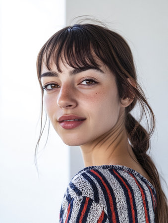 A confident young woman stands indoors, smiling softly while looking over her shoulder. She wears a striped sweater, highlighting her relaxed style and natural beauty in a well-lit space.