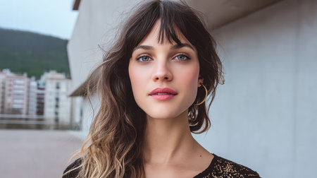 A woman stands confidently in a narrow street showcasing her stunning voluminous hair and relaxed expression. The warm light of golden hour highlights her features creating a striking atmosphere.