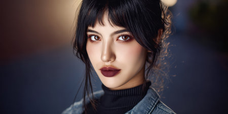 A young woman with long, dark hair and striking features stands outside. She wears a denim jacket and looks confidently at the camera as twilight sets in, with a soft glow illuminating her face.