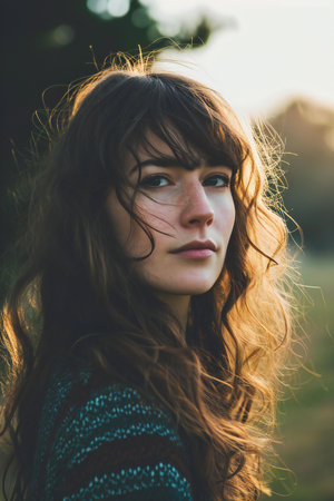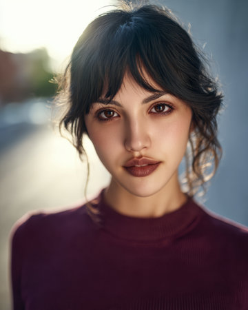 A young woman stands outdoors, showcasing her beauty in soft sunlight. Her wavy dark hair frames her face, and she wears a deep-colored top. The warm glow of the setting sun enhances her features.