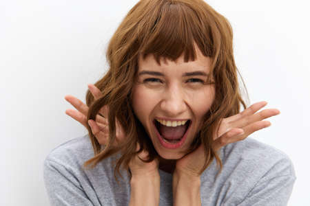 a funny, charming, curly-haired red-haired woman stands on a white background in a gray T-shirt and looks at the camera with her mouth wide open, emotionally screaming holding her fingers in her hair