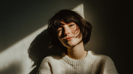 A serene portrait of a young woman bathed in soft light and gentle shadows, showcasing her natural beauty in a cozy sweater. The atmosphere exudes calmness.