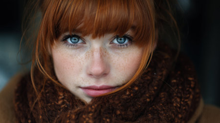 Young caucasian female with red hair and blue eyes wrapped in brown scarf.