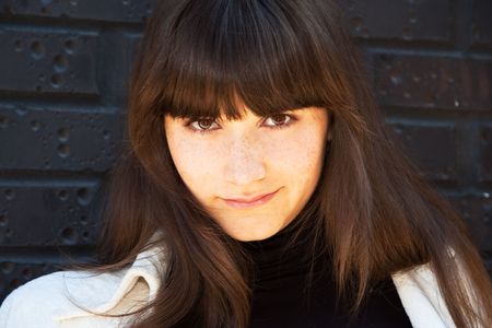 A young woman with dark hair and striking blue eyes, her face adorned with freckles, looks directly at the camera. The background is blurred, suggesting an urban environment with tall buildings.