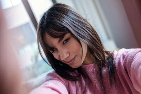 Shot of pretty young woman taking a selfie near to the window in the living room at home.