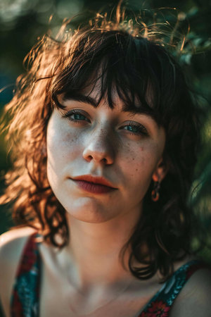 A young woman with curly hair gazes confidently at the camera. Soft natural light highlights her features creating a warm and inviting atmosphere in a cozy indoor space.