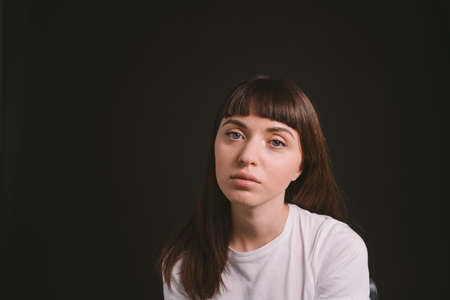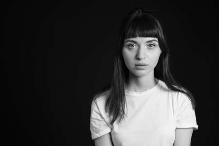 Studio portrait of a pretty brunette woman in a white blank t-shirt, against a plain black background, looking at camera