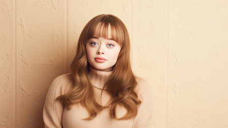 Portrait of smiling laughing woman with Down syndrome creamy beige background. Advertisement men's cosmetics products, hair care products, medicines, perfumes, cosmetology, courses, school college and trainings. lifestyle, World Day Genetic Diseases