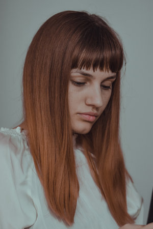 A vertical shot of a young Caucasian female portrait with a thoughtful expression