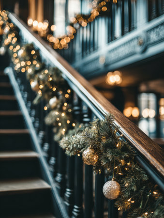 A beautifully decorated staircase features lush garlands and warm lights, creating a cozy ambiance for holiday celebrations in a historic venue.